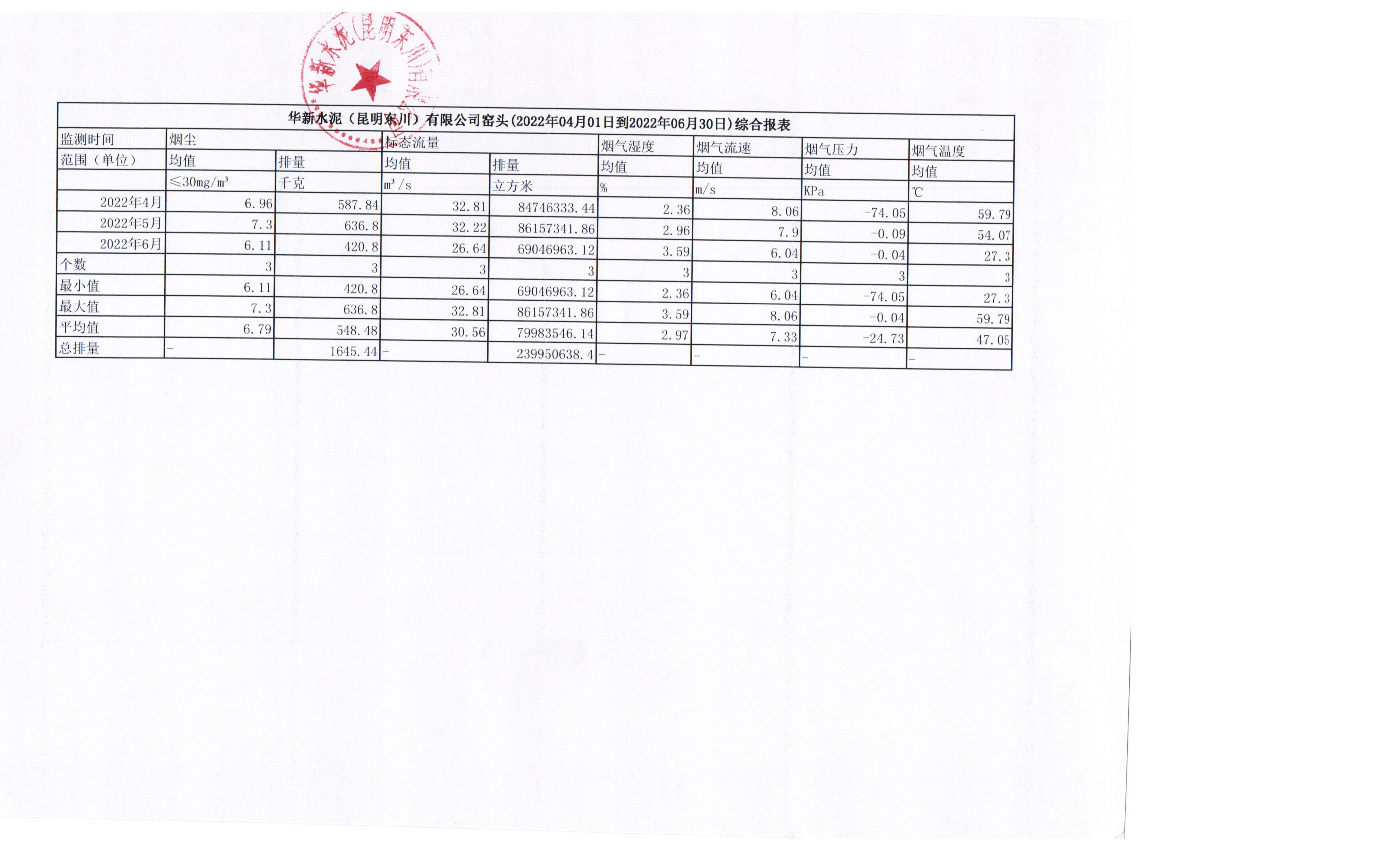 3、華新水泥(昆明東川)有限公司2022年第二季度窯頭煙氣在線監(jiān)測月平均值季報表