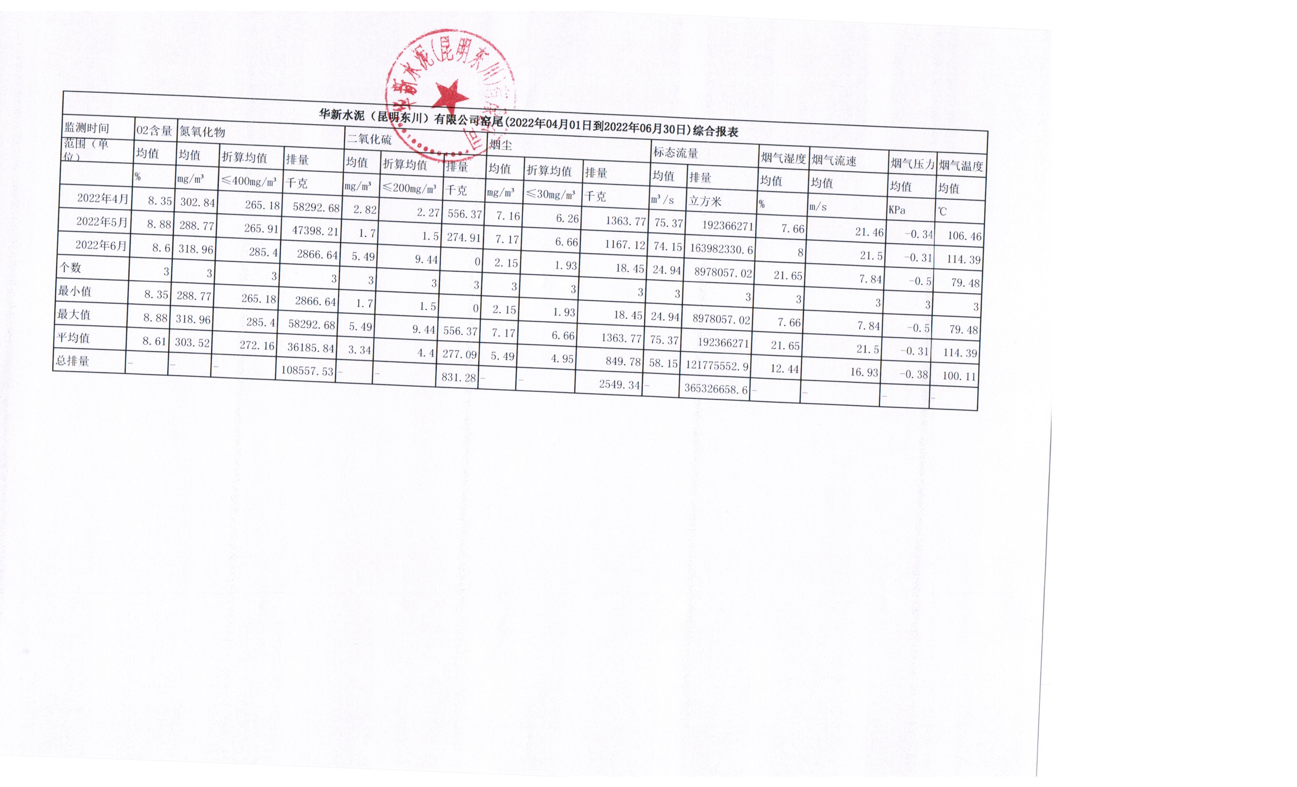 4、華新水泥(昆明東川)有限公司2022年第二季度窯尾煙氣在線監(jiān)測月平均值季報表