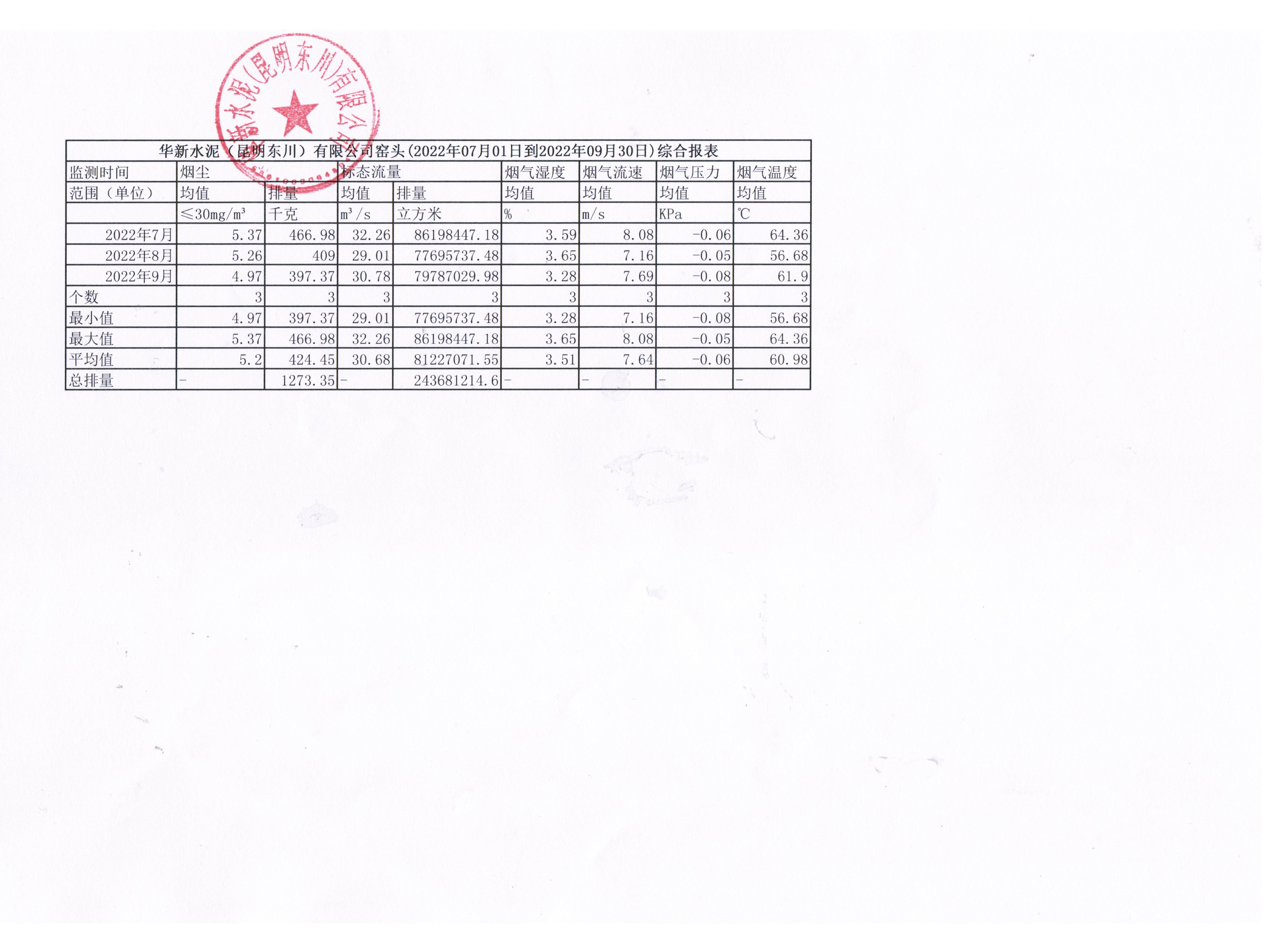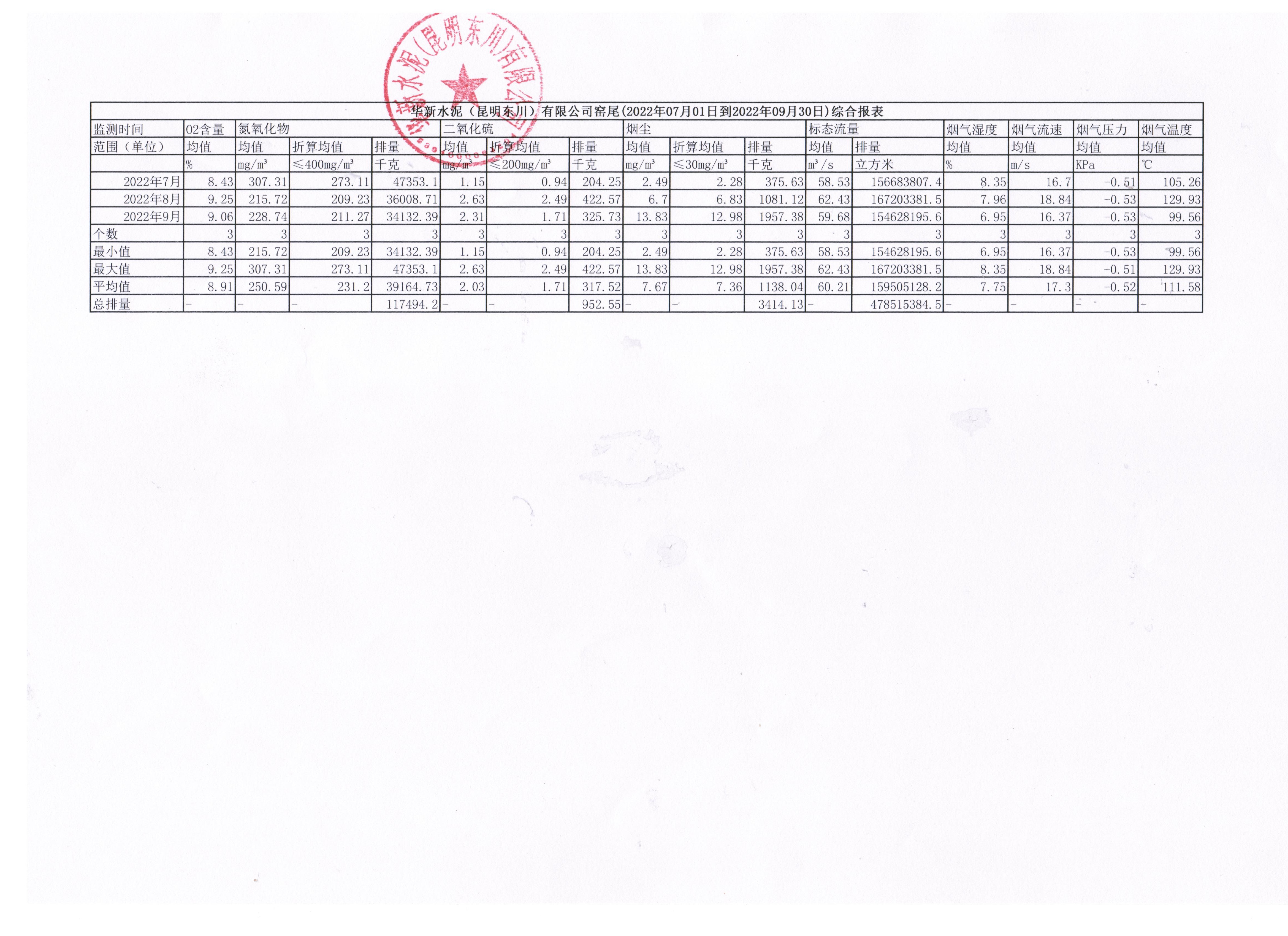 4、華新水泥(昆明東川)有限公司2022年第三季度窯尾煙氣在線監(jiān)測月平均值季報(bào)表