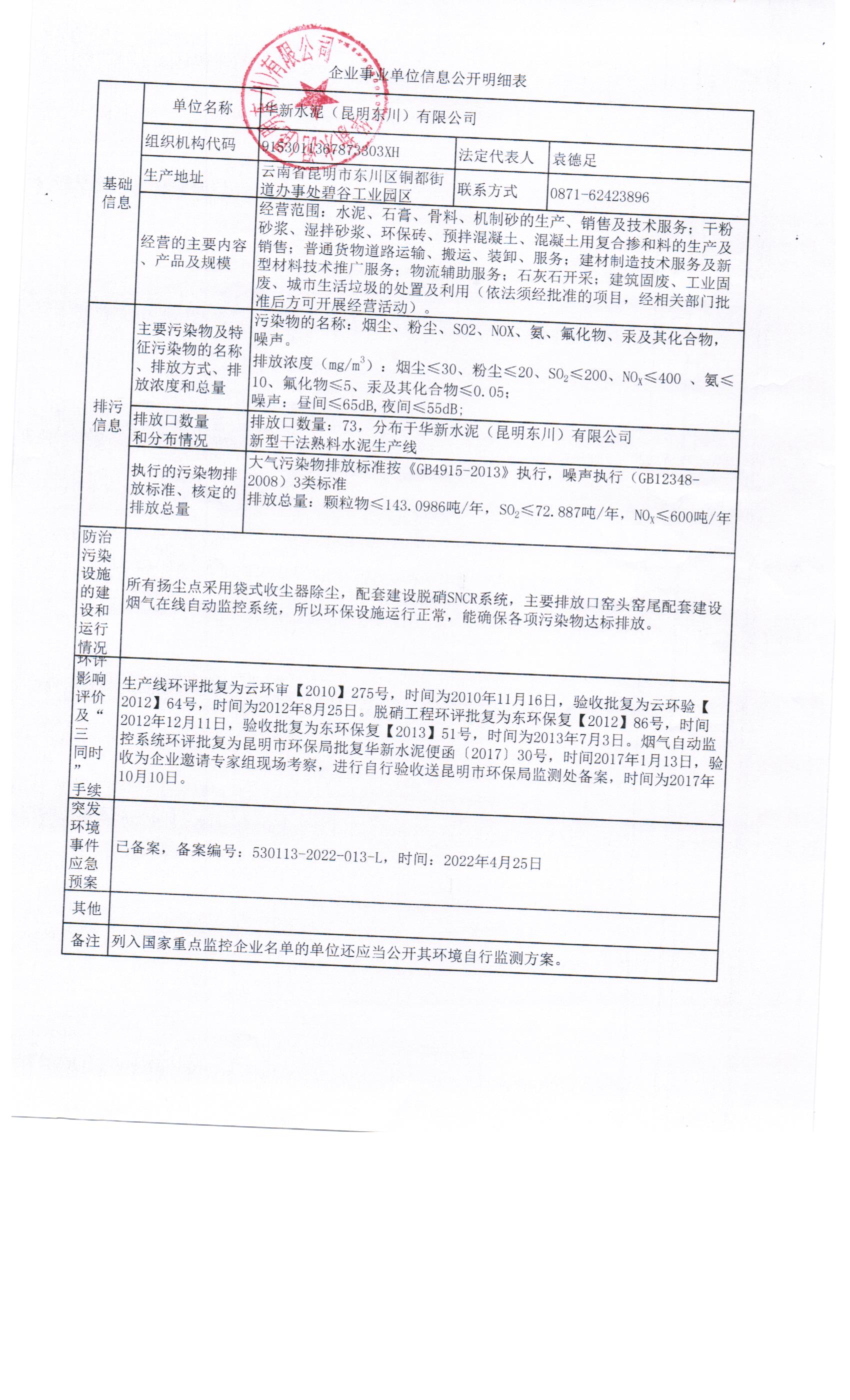 根據(jù)企業(yè)事業(yè)單位信息公開文件要求,華新水泥(昆明東川)有限公司對企業(yè)事業(yè)單位信息明細表(包含基礎信息、排污信息、防治污染設施建設和運行情況、環(huán)評影響評價及“三同時”手續(xù)、突發(fā)環(huán)境事件應急預案),自行監(jiān)測方案,2024年第一季度窯頭在線監(jiān)測季度報表,2024年第一季度窯尾在線監(jiān)測季度報表,第一季度比對委托監(jiān)測,第一季度自行性委托監(jiān)測進行公示。