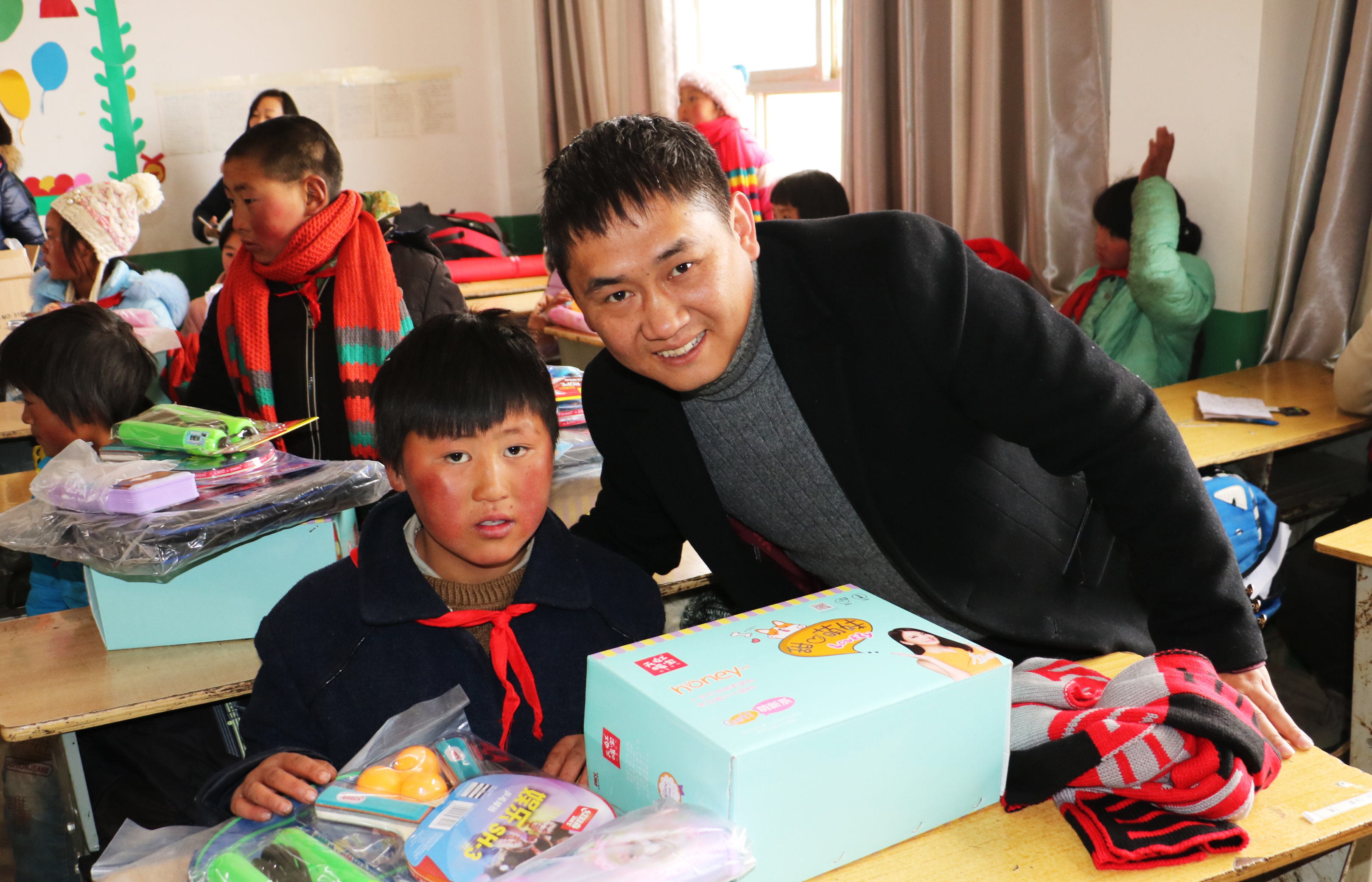 上圖均為志愿者為孩子們獻愛心,送上學習和取暖用品