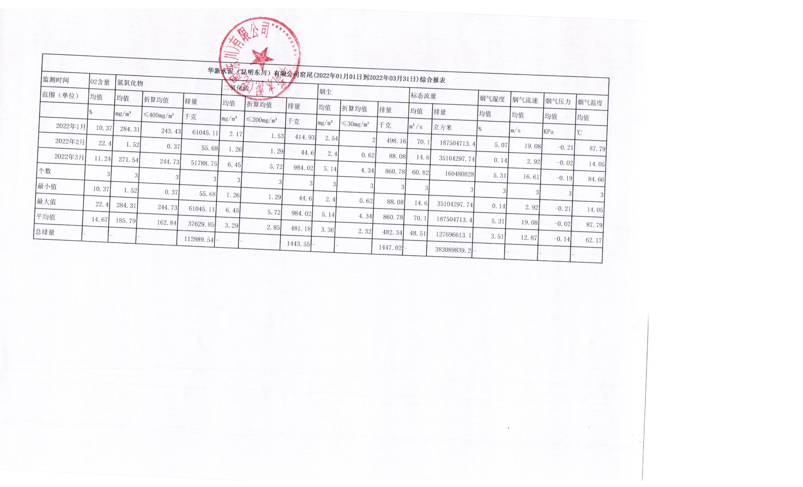 4、華新水泥(昆明東川)有限公司2022年第一季度窯尾煙氣在線監(jiān)測(cè)月平均值季報(bào)表