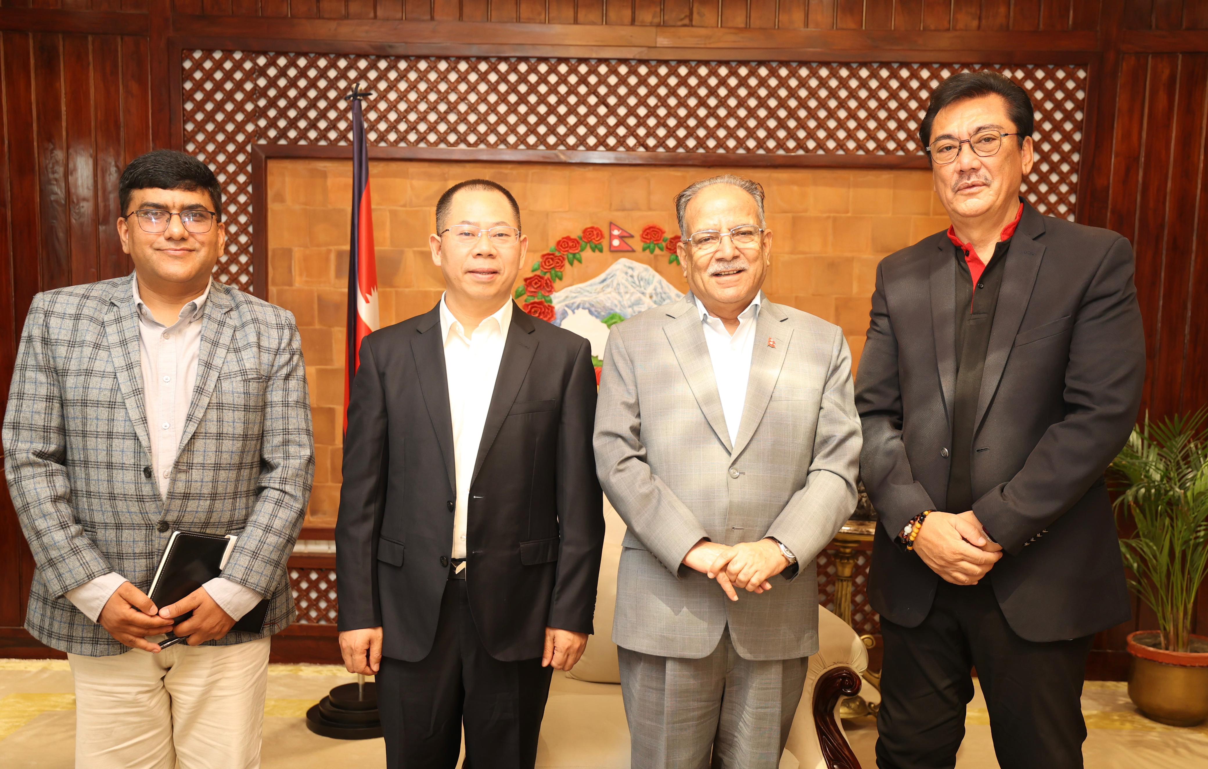 尼泊爾國家總理普拉昌達(右二)會見華新尼泊爾納拉亞尼公司總經(jīng)理向長宏一行